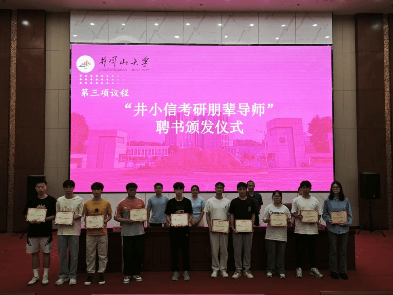 在庄重的聘任仪式环节,学院领导为首届32名“井小信考研朋辈导师”颁发聘书,希望他们能发挥榜样引领作用,从线上线下全方面多角度助力学弟学妹考研上岸。