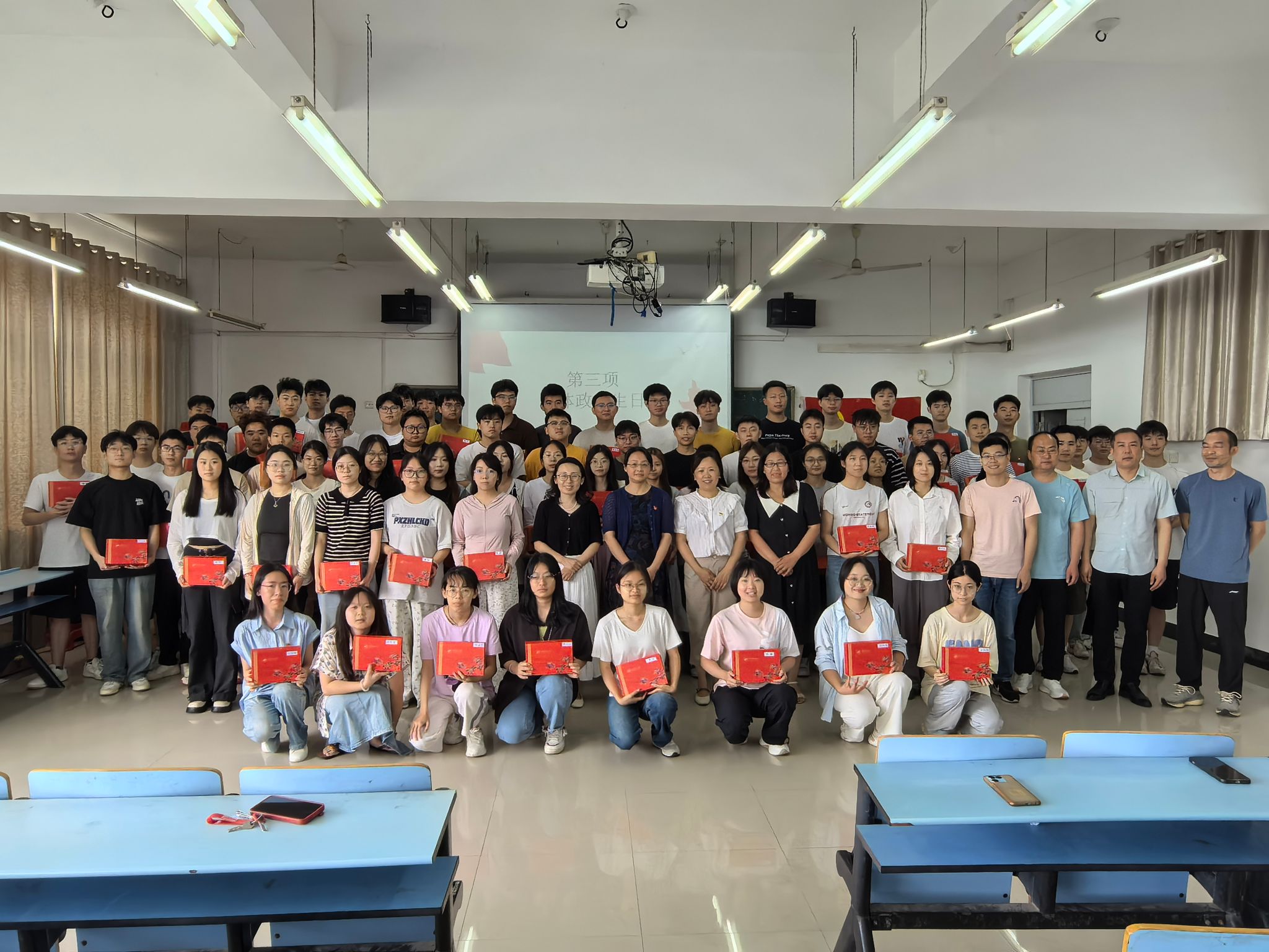 各支部书记给毕业生党员发放红色成长礼盒。成长礼盒包含:一封家书、一本党费证、一部党章、一枚钥匙扣。《致毕业生党员的信》,是党组织写给党员的“人生锦囊”,提醒党员们党员身份是一个光荣的称号,更是不可推卸的责任;一本党费证,记录着党员从被组织关爱到主动回报的成长历程,是党员与党组织之间的“精神契约”;一部《中国共产党章程》,是每位党员的“灯塔”,在迷茫时为党员指引方向;印有井冈山大学 logo 的钥匙扣,是母校送的“时光钥匙”,承载着党员在母校的美好回忆,让刻在骨子里的井冈山精神永远照亮前行的道路。