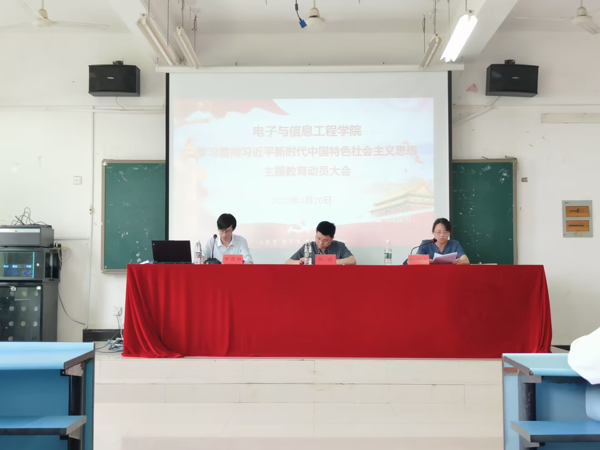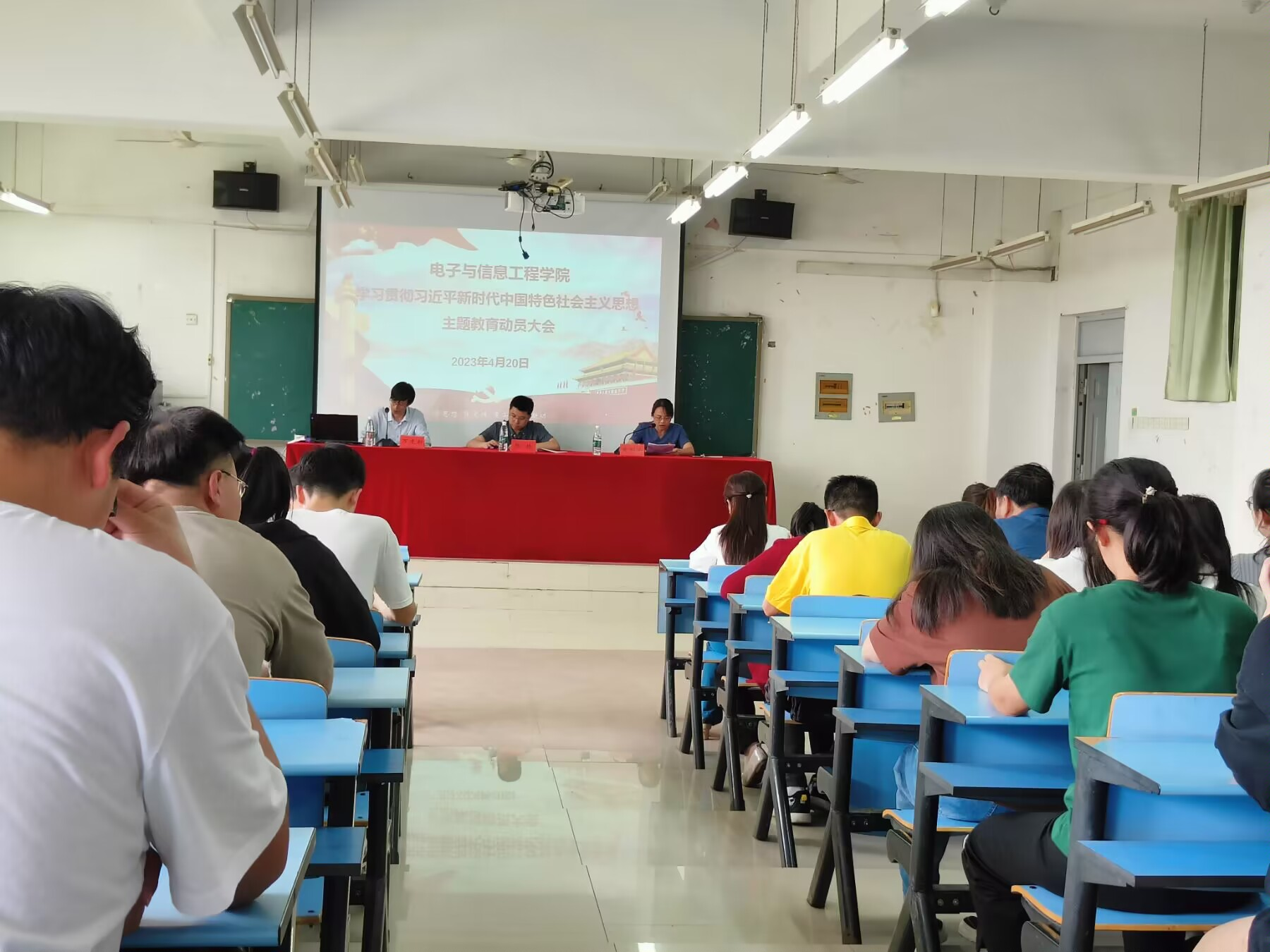 4月20日下午,电子与信息工程学院召开学习贯彻习近平新时代中国特色社会主义思想主题教育动员会,学习传达习近平总书记在中央主题教育工作会议上的重要讲话精神和学校主题教育动员会精神,对学院主题教育工作进行动员和部署安排。校长助理张赫到会指导,院党委书记黄郁南作动员讲话。学院班子成员、支部书记、全体党员、师生代表参加会议。