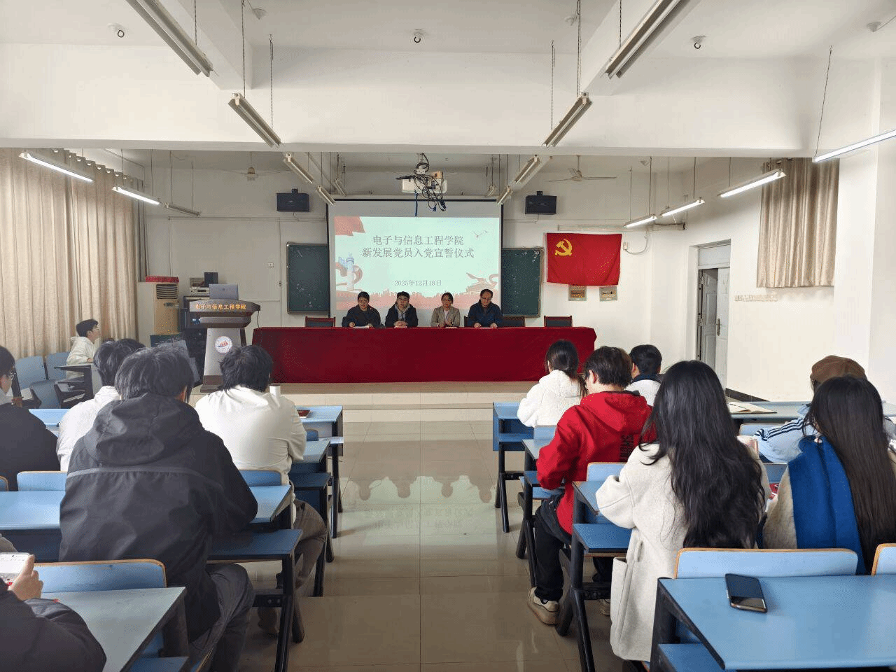为筑牢新发展党员的理想信念根基,激发青年使命担当,12月18日下午,电子与信息工程学院党委在10B301教室隆重举行了2025下半年新发展党员入党宣誓仪式。院领导、支部书记、全体新发展党员以及部分老党员代表参会,党委组织员陈琦主持会议。