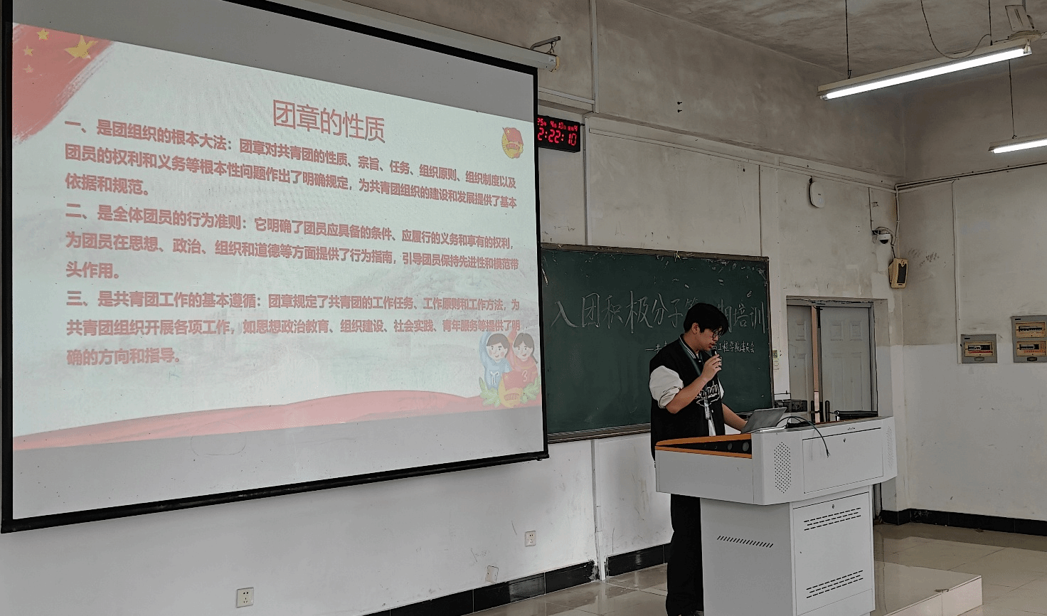 培训伊始,主讲人强调了加入共青团的重要意义。他指出,加入共青团不仅是青年热爱国家和人民的表现,更是作为中国共产党有力后备军的关键体现。随后,主讲人带领入团积极分子深入学习共青团的基本知识,从团章性质、共青团任务、共青团精神到团歌、团旗、团徽、团员证等内容展开全方面讲解。在讲解团员的权利与义务时,主讲人详细阐述了团员应遵循的行为准则,并分享了诸多青春榜样的先进事迹,鼓励同学们以榜样为引领,在学习和生活中汲取奋进力量。培训过程中设置的互动交流环节将活动推向高潮,同学们积极分享学习感悟,在交流中深化了对共青团的理解,现场学习氛围浓厚。