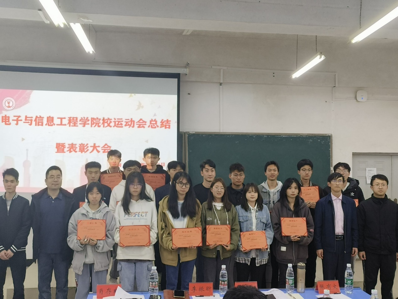 为了表彰运动员在赛场上的优异表现与总结评议一年来团委学生会各部门的工作,电子与信息工程学院于2023年3月17日在10栋A006组织举办运动员表彰大会暨述职评议大会。本次大会邀请到了学院党委副书记万建新老师;团委副书记、学生科副科长李振昕老师;学生科专职辅导员张有文老师、学生科专职辅导员肖存威老师,由周林担任此次大会的主持人。