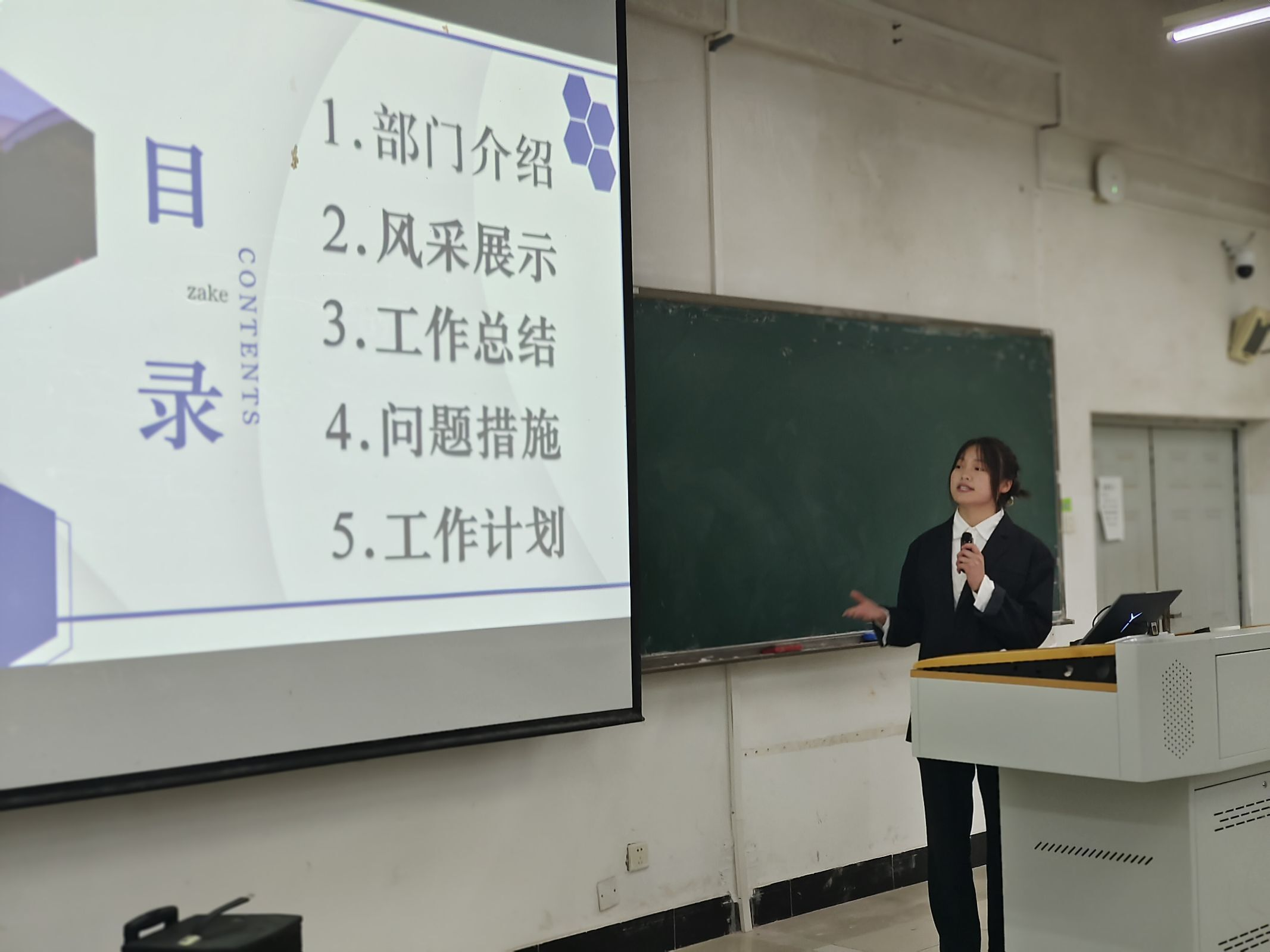 活动开始,大屏幕播放了运动健将们尽情展现自己风采的视频,振奋人心。紧接着,李振昕老师宣布了本次表彰的运动员名单,并发表讲话。短暂休会后,开始述职评议大会,各个部门的主讲人上台宣讲,总结一年来的工作、成绩、不足。在宣讲完毕后,由万建新老师提问,表扬工作中的优点,提出不足以及改进意见。在大会最后,由万建新老师发表讲话,大会在总结与反思中结束。