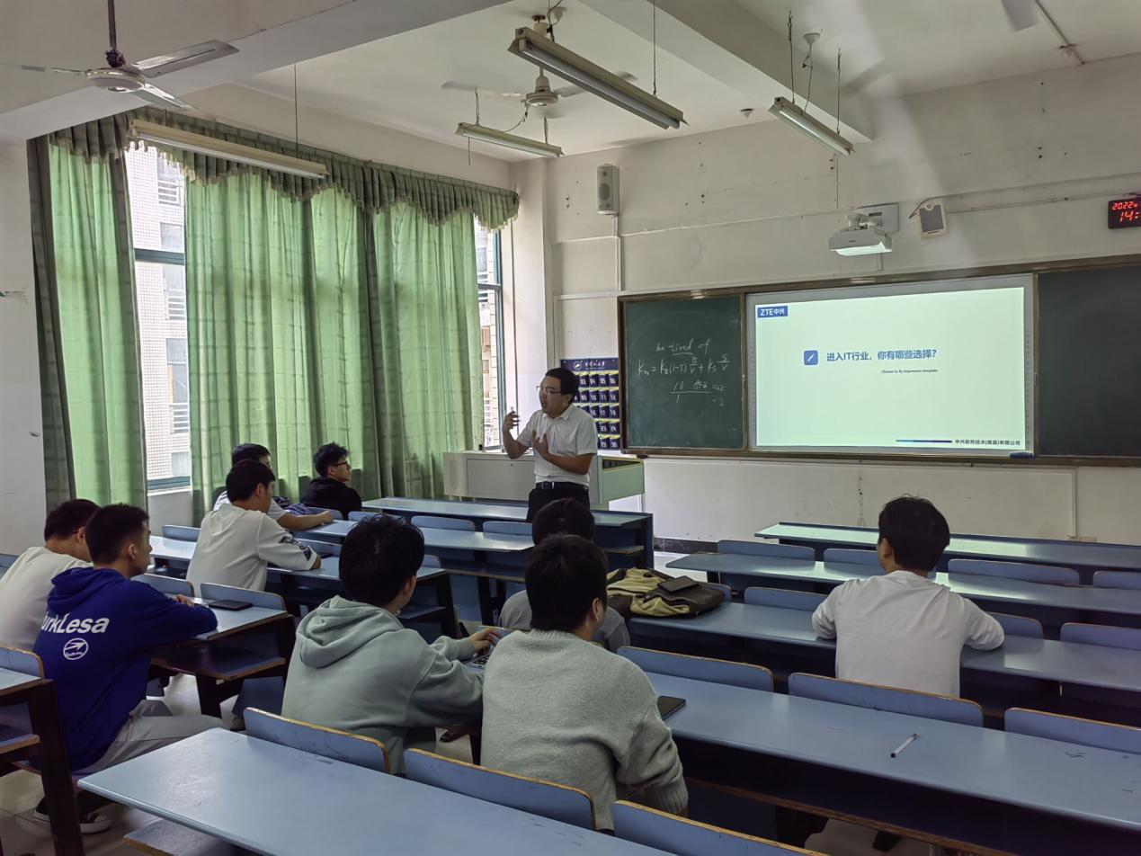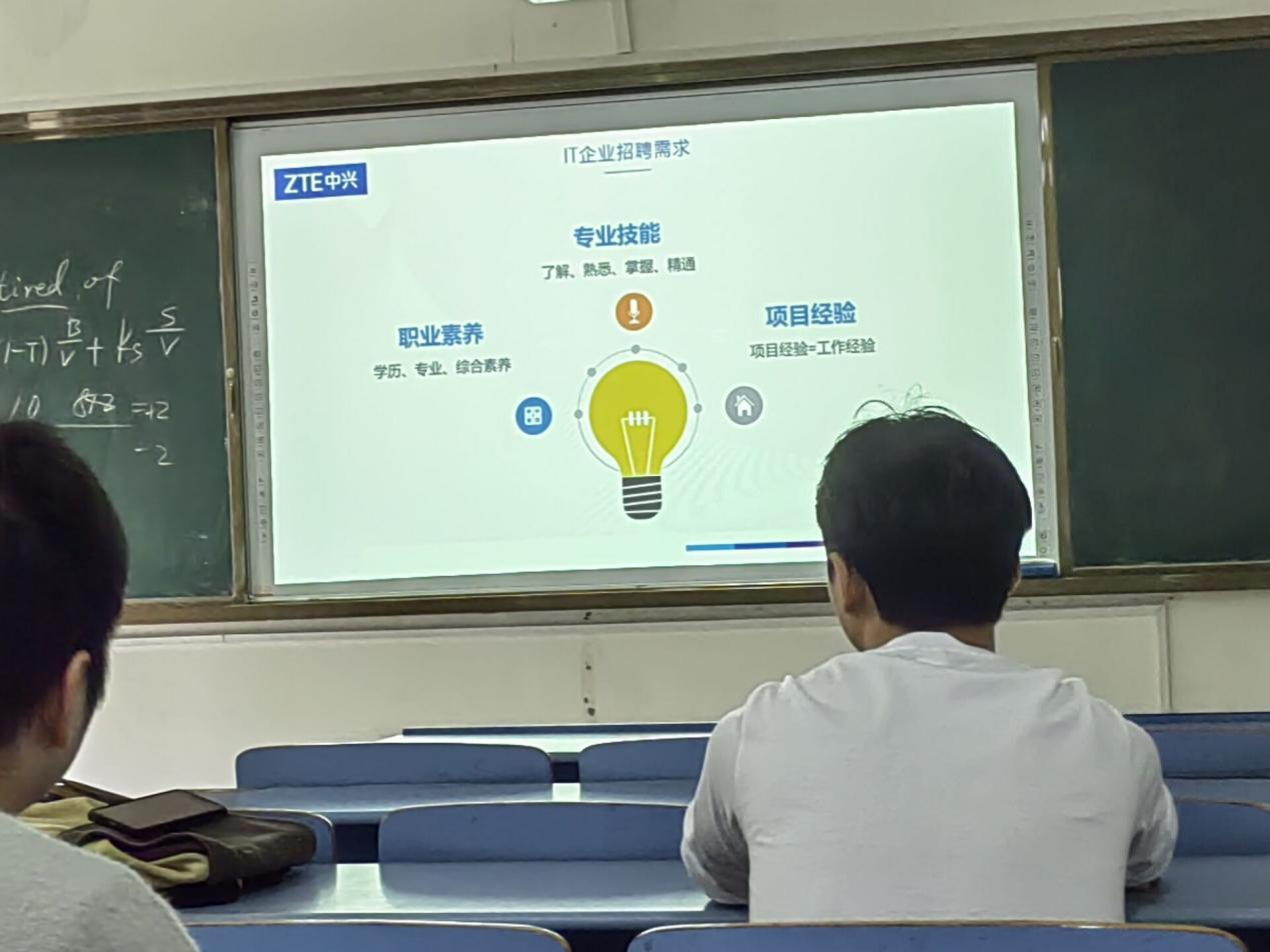 活动开始,南昌中兴软件有限公司的主讲人进行了就业指导讲座,通过播放宣传片、PPT展示、面对面交流等方式向同学介绍公司的概况、职业发展方向、人员需求等。最后,南昌中兴软件有限公司的主讲人与同学们进行交流,详细解答了同学们关于实习招聘的相关疑惑,让同学们对就业形势有了更深入的了解。