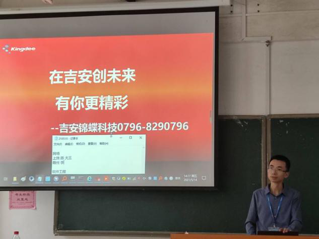 会上,吉安锦蝶科学有限公司的宣讲人刘秋发首先介绍了公司的概况,让同学们对吉安锦蝶科学有限公司有初步的了解。其次,宣讲人刘秋发分别详细地介绍了公司的优秀员工,产品的定位,以及分析对比了“账无忧”的优势和公司的培训历程。宣讲结束后,同学们积极提问,宣讲人热情解答,让同学们进一步了解该公司情况。