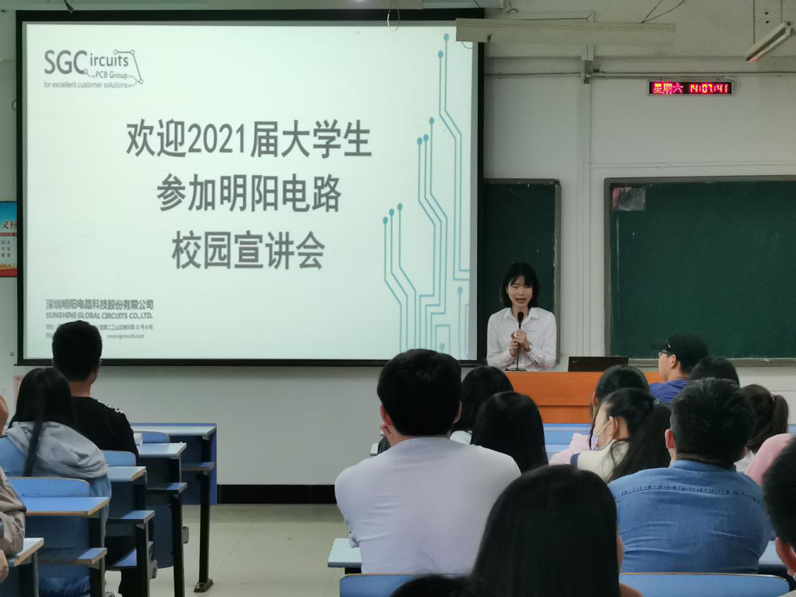 会上,明阳电路有限公司的宣讲人徐经理给毕业生们放了公司宣传视频,让毕业生们对公司有了初步的了解。视频过后,徐经理对公司概况进行一些简短补充,并向毕业生们介绍公司的产品研发、企业文化、招聘需求、员工福利等内容。介绍结束之后,同学们积极提问,公司工作人员热情解答,接着有意向的毕业生向公司递简历,并进行了面试、笔试,最终有部分同学与企业达成了初步意向。