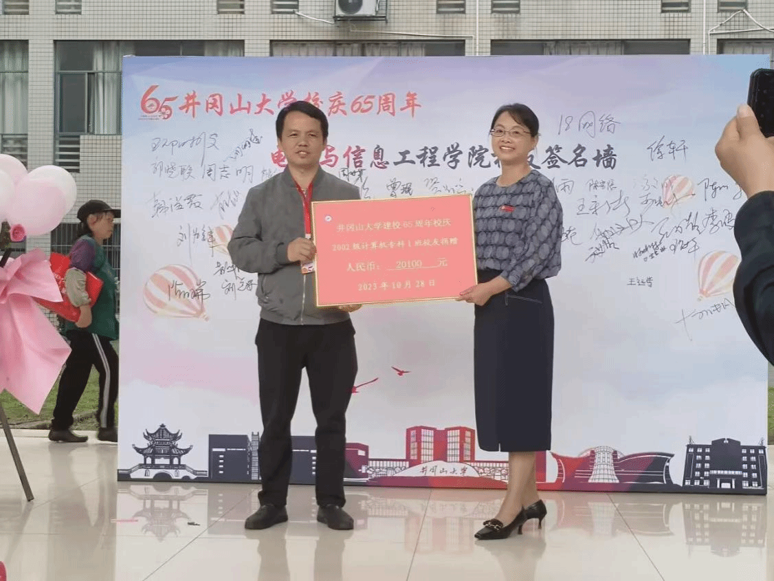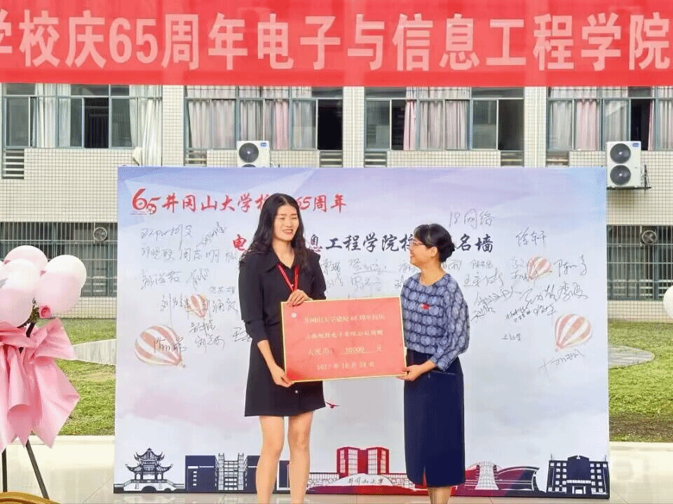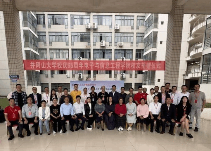 10月28日下午,电子与信息工程学院庆祝井冈山大学建校65周年“情系母校,共铸辉煌”捐赠仪式在第十教学楼一楼大厅举行。学院党委书记黄郁南、党委副书记万建新、部分班主任与返校历届校友、校企合作企业代表共计百余人出席了本次活动。