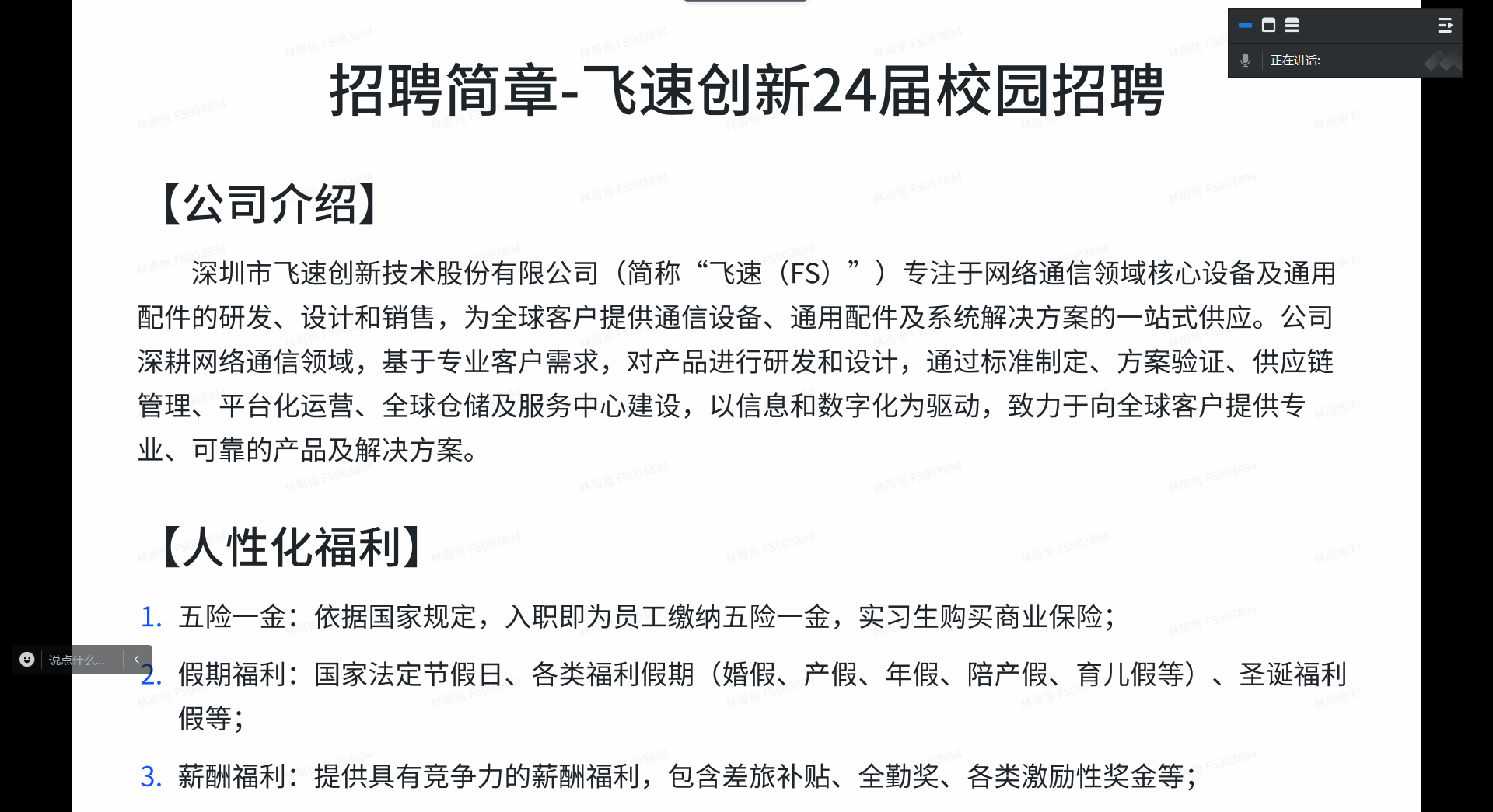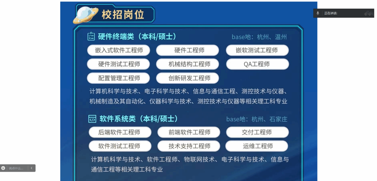 招聘会共邀请了五家企业,分别是深圳市飞速创新技术股份有限公司、海格通信、金卡智能集团股份有限公司和京东方科技集团股份有限公司。五家用人单位通过展示企业宣传片、招聘PPT等方式进行宣讲,向毕业生介绍企业文化、岗位需求和薪资待遇等招聘信息。此次招聘会共提供60多个岗位,毕业生们针对自己感兴趣的问题与相关企业在线进行交流,了解用人单位的基本情况并表达自己的求职意向。