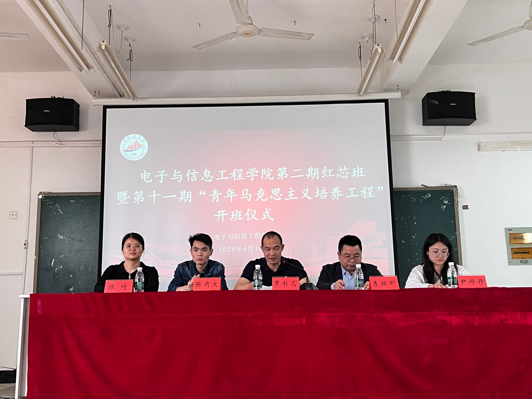 4月18日中午在十栋B301,电子与信息工程学院举办第二期“红芯班”暨第十一期“青年马克思主义培养工程”开班仪式。学院党委副书记罗书嵩、全体专职辅导员、第二期“红芯班”、第十一期“青年马克思主义培养工程”全体学员参加会议、会议由学生科科长李振昕主持。