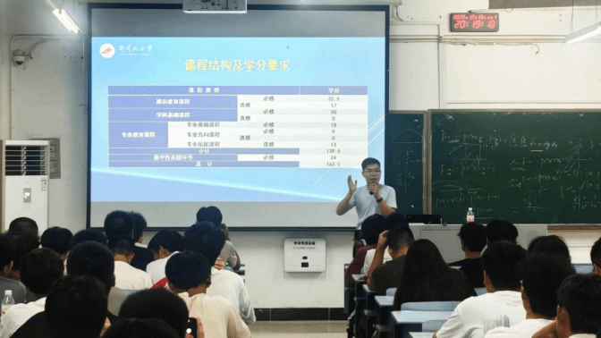 随后,针对专业核心课程,主讲老师详细说明各课程的课时分配与学分权重,为新生构建起专业知识学习的脉络图,便于他们提前规划课程学习的优先级与节奏;此外,还系统介绍学科就业前景,明确学习目标和毕业要求,既拓宽了新生的职业视野,又进一步激发其学习动力。期间,学院特别邀请优秀学长登台分享,学长结合自身经历,从专业知识深耕、时间高效管理等维度传授实用经验,为新生的专业学习之路提供切实指引。