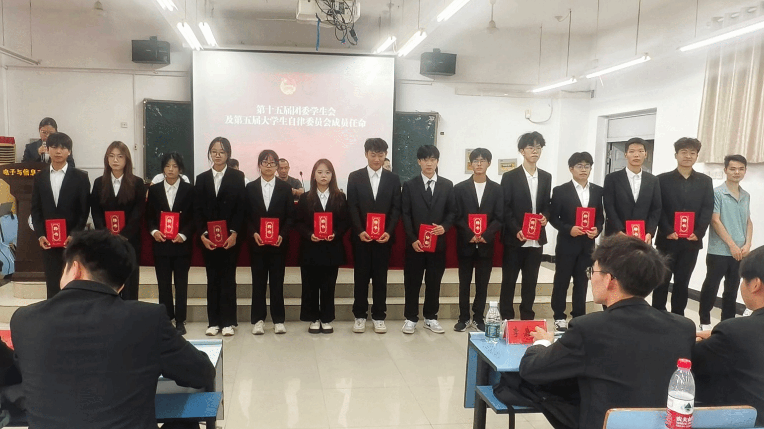 大会伊始,肖存威老师宣读了优秀成员名单,并为其颁发荣誉证书,表彰他们在学生工作中的突出表现。随后,肖老师宣读了第十五届团委学生会、第五届大学生自律委员会成员名单及团委学生会主席团成员名单,并为新一届学生骨干颁发聘书。
