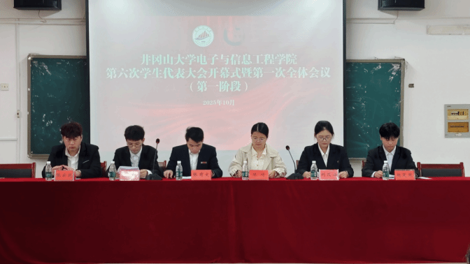 为充分发挥学生组织的桥梁纽带作用,凝聚广大同学的智慧与力量,助力学生全面发展,服务学校建设大局,电子与信息工程学院于2025年10月26日在10栋B301教室隆重召开第六次学生代表大会。电子与信息工程学院团委副书记、学生科副科长张有文,学生科专职辅导员陈琦,校学生会主席团代表刘苡涵,以及商学院、机电工程学院、中医药学院、建筑工程学院、数理学院、基础医学院和临床医学院等学院的主席团代表出席本次大会。我院113名学生代表(含少数民族代表、班级代表)共同参会。