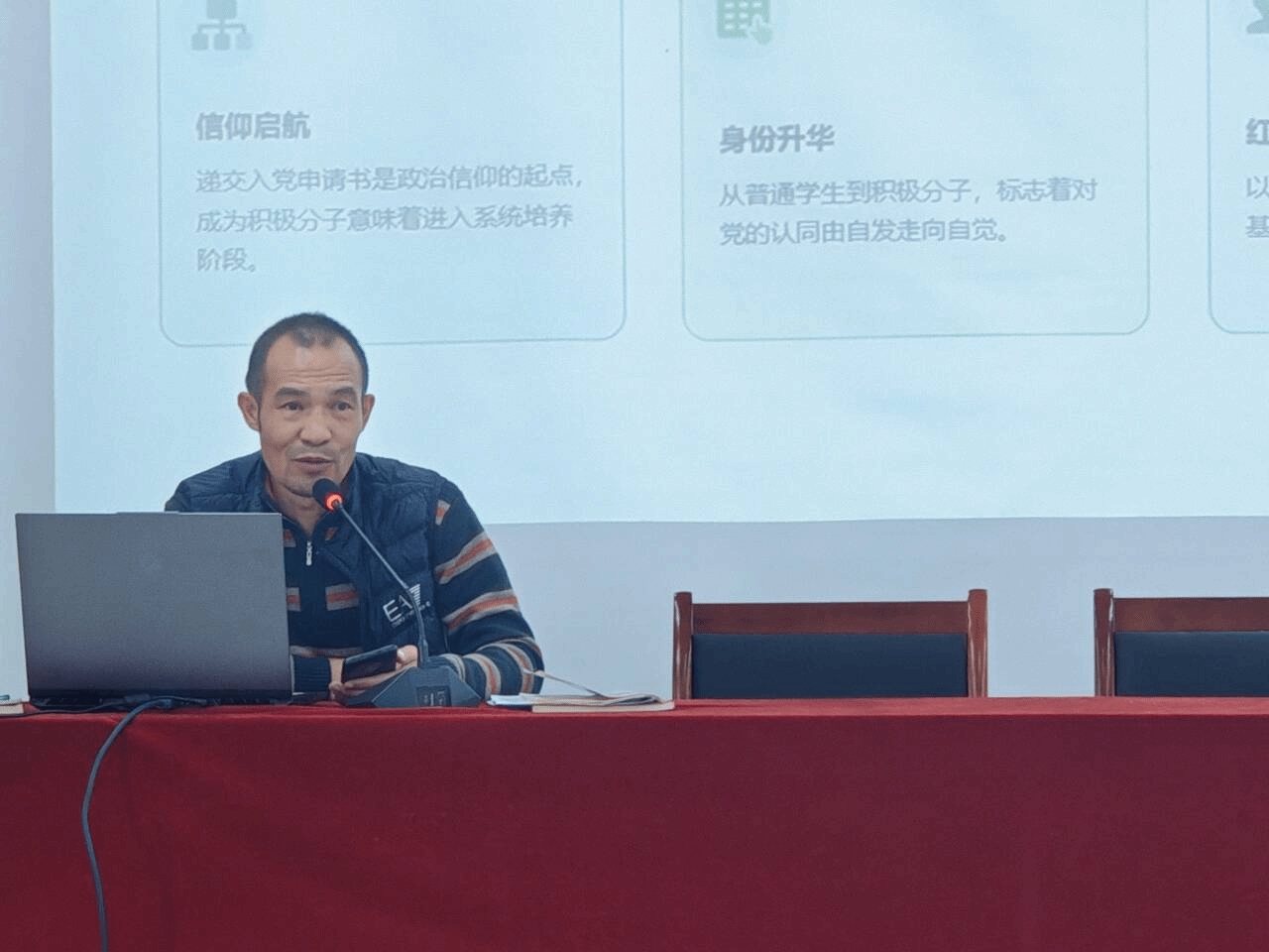 开班仪式在庄严的国歌声中拉开序幕。陈琦老师首先对本期入党积极分子培训班方案和学习重点进行了详细说明,让学员们明晰了学习方向与要求。紧接着,23计本2班的杨柳同学作为入党积极分子代表发言,她分享了自己对党的理论与宗旨的理解和感悟,表达了将以严谨态度投入学习、以实际行动践行使命的决心,把党的宗旨融入日常行动中,积极地向党组织靠拢。最后,罗书嵩书记结合青年成长与党的事业发展,对全体学员提出具体要求和殷切期望:要坚定理想信念,将个人成长融入时代发展;要勤学善思,把党的理论转化为行动指南;要以身作则,在同学中树立先锋形象,争取早日加入党组织。