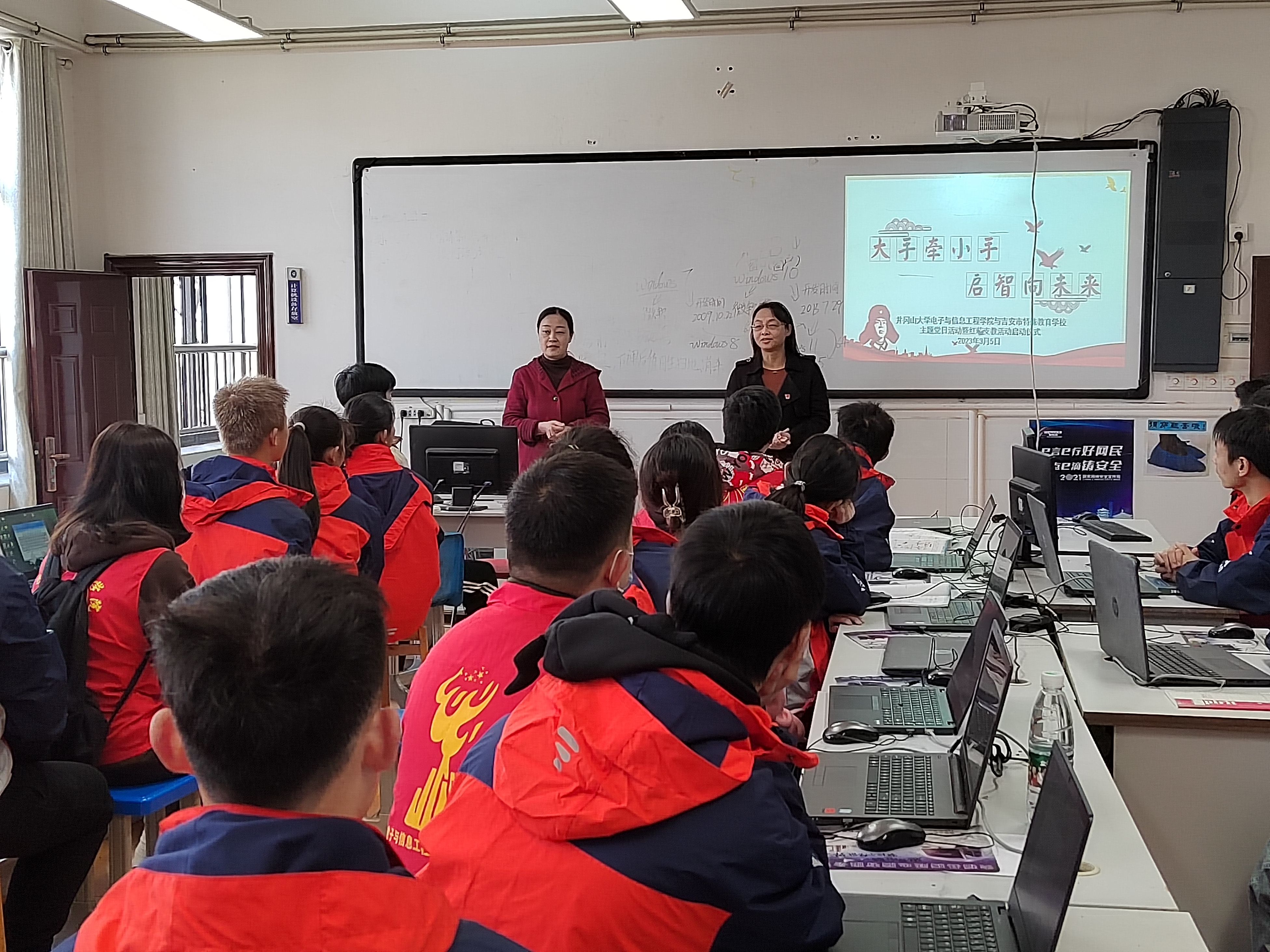 3月5日上午,学院部分师生党员走进吉安市特殊教育学校,开展了以“小手牵大手,启智向未来”为主题的“井小信来了——红芯支教”志愿服务活动,为特殊教育学校的听障学生传授计算机方面的专业知识,同时通过破冰游戏和手语互动等活动让孩子们感受到来自社会的浓浓关爱,受到特殊教育学校师生的一致好评。