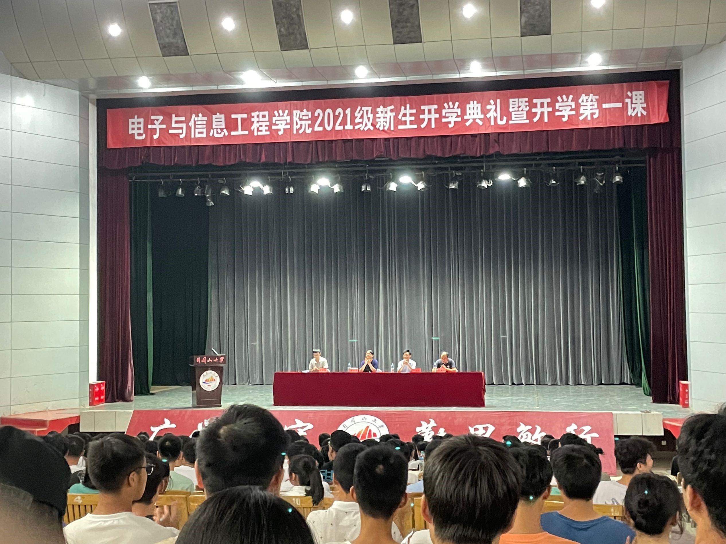 10月8号晚,电子与信息工程学院举行2021级新生开学典礼暨开学第一课。院领导、教师代表、新生班主任、辅导员出席,2021级全体新生参加。党委书记黄郁南为全体新生讲“开学第一课”,院长罗文浪作报告,院党委副书记万建新主持会议。