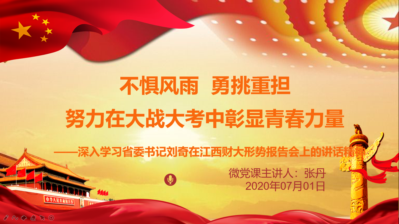 党课结束后,各支部书记纷纷响应,分别开展了支部书记的党课开讲活动。学生党支部开展了《不惧风雨 勇挑重担努力在大战大考中彰显青春力量——深入学习省委书记刘奇在江西财大形势报告会上的讲话精神》为主题的微党课。党员们表示深受鼓舞,要在抗疫大考中展现出青春的力量。