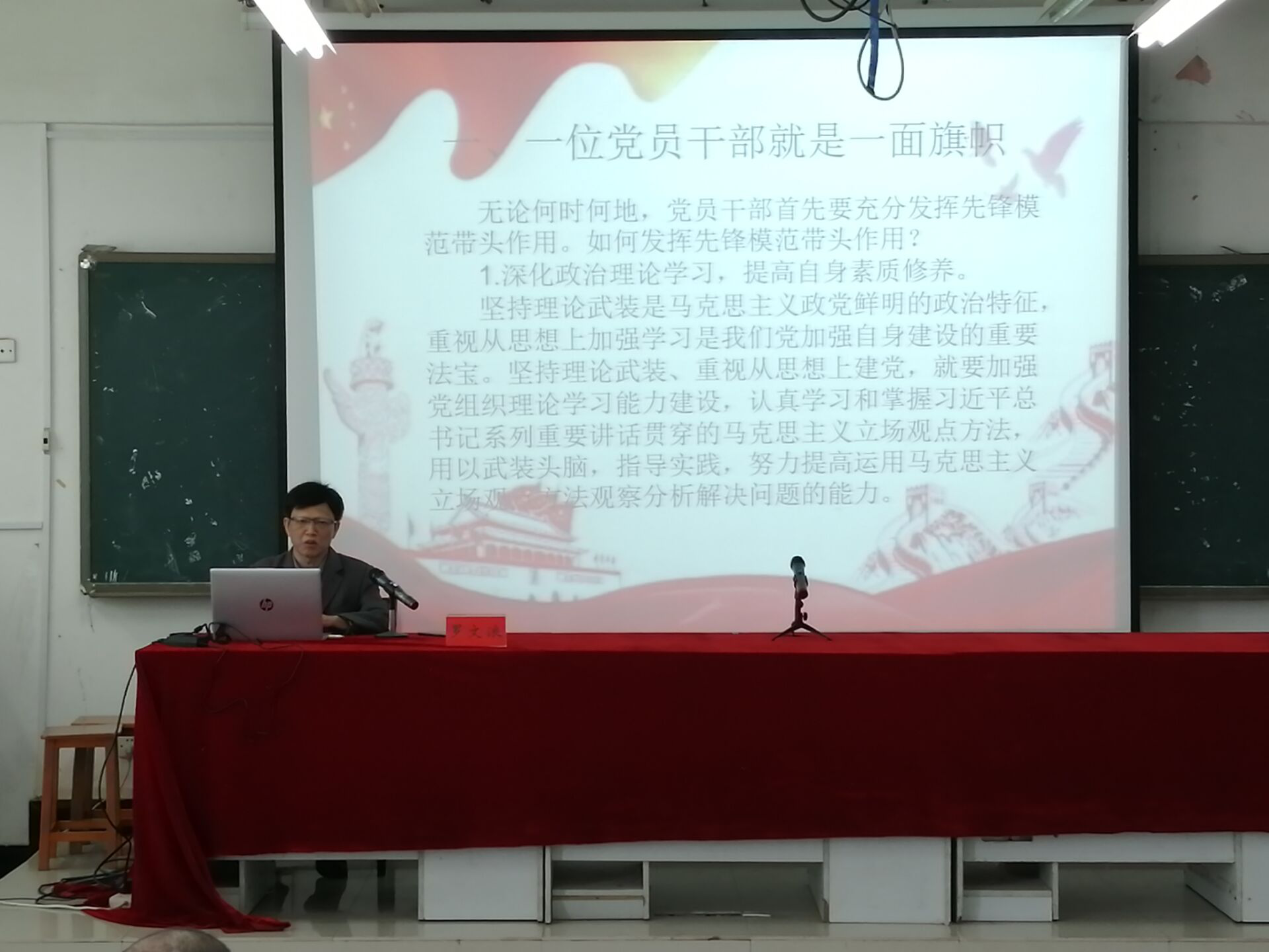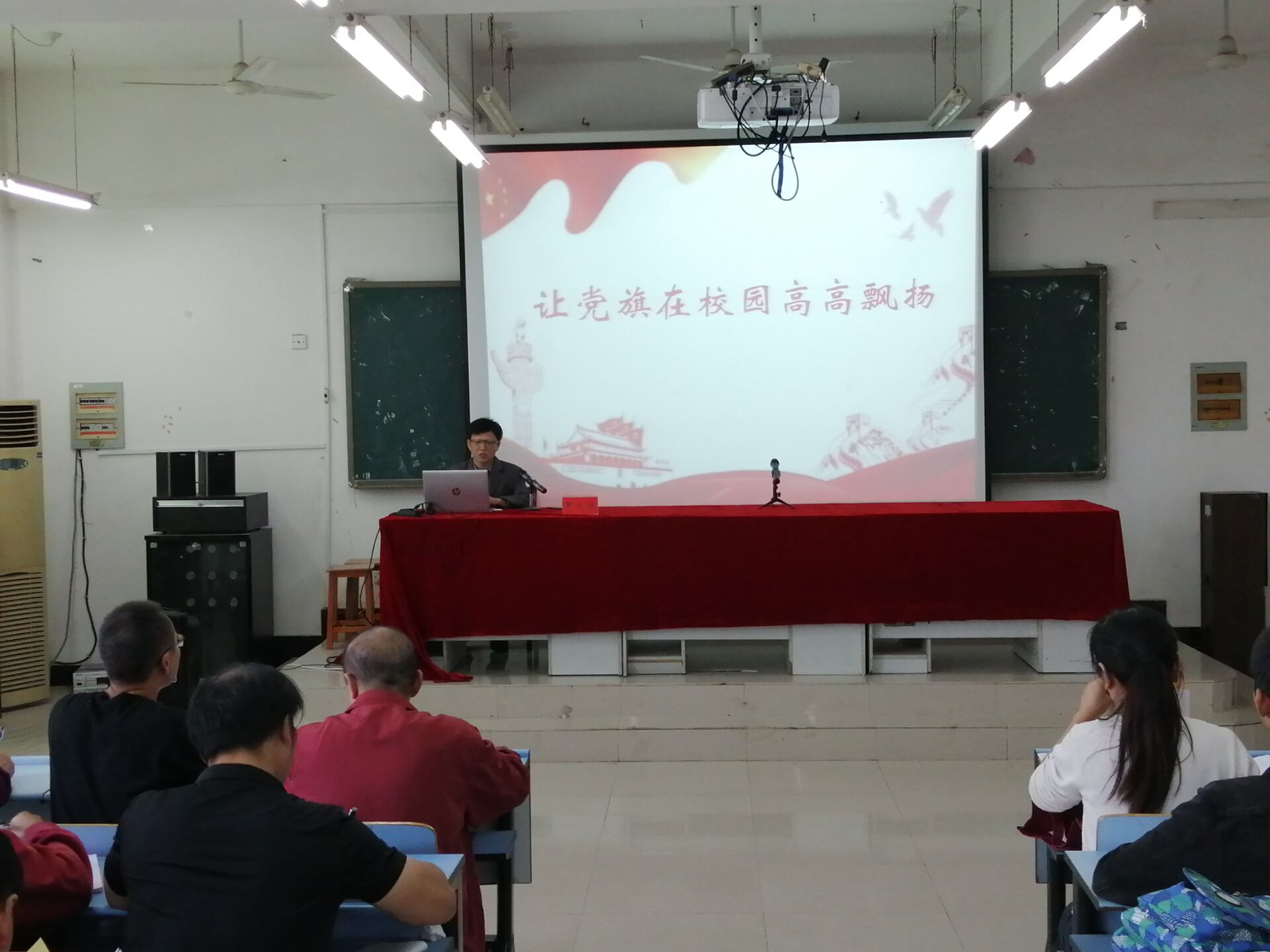 党课以“让党旗在校园高高飘扬”为主题,分别讲述了“一位党员干部就是一面旗帜,一位党员教师就是一面旗帜,一位党员学生就是一面旗帜”。罗院长从以上三个角度带领全体党员回望初心,旨在让党员明白:每位党员都是一面旗帜,都应该发扬先锋模范带头作用,全体党员都有义务让党旗在校园高高飘扬。